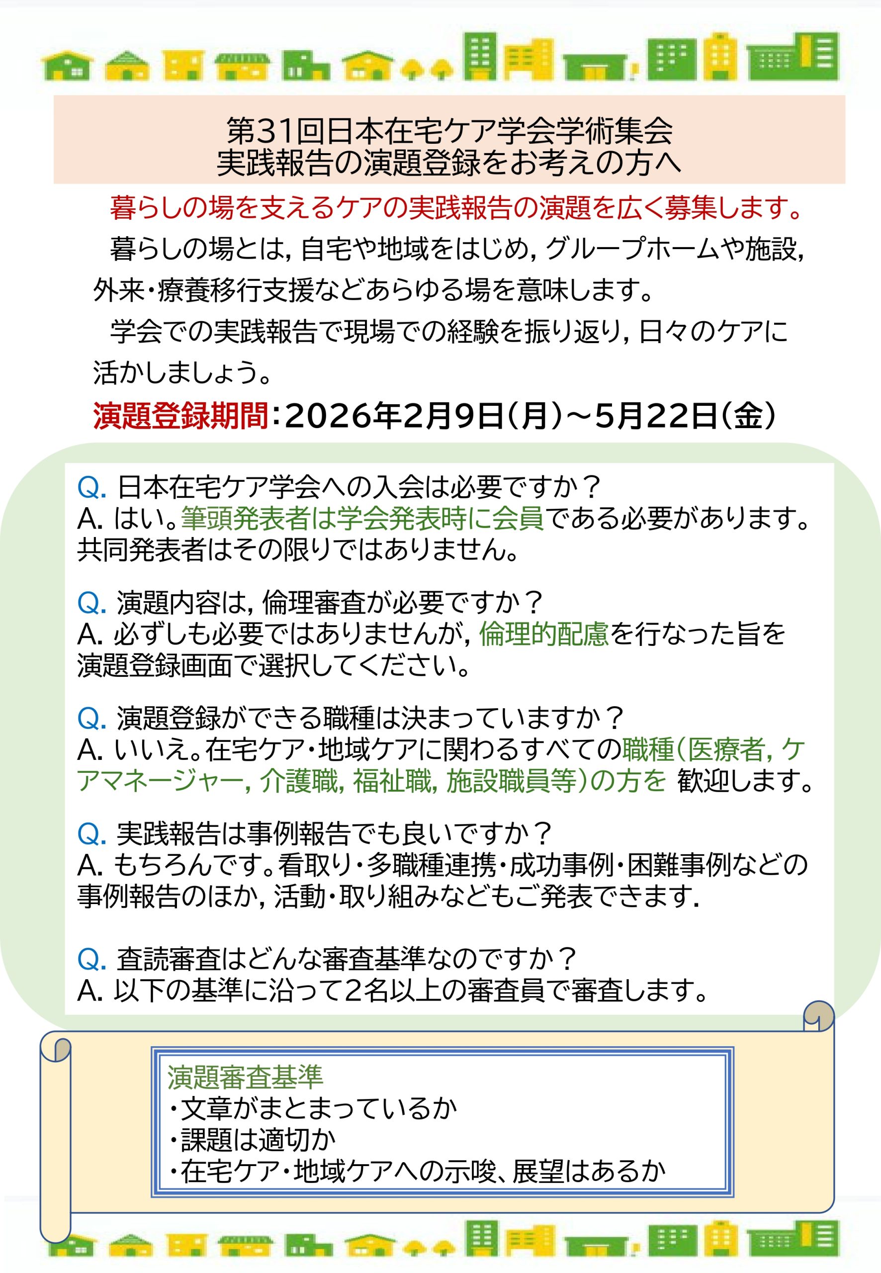 お願いです。第31回日本在宅ケア学会学術集会の一般演題登録が開始(2月9日~5月22日)になりました。